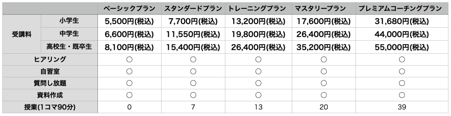 また、トレーニングプランの方で毎日1コマずつ入れられるコマ数、プレミアムコーチングプランでは毎日3コマずつ入っていただけます。プレミアムコーチングプランはマスタリープランの約2倍のコマ数入っていただけますので、料金的に実質最もお得にはなるのですが、お休みされた場合の振替が困難であるというデメリットもございますので、その点のみご了承下さいませ。
