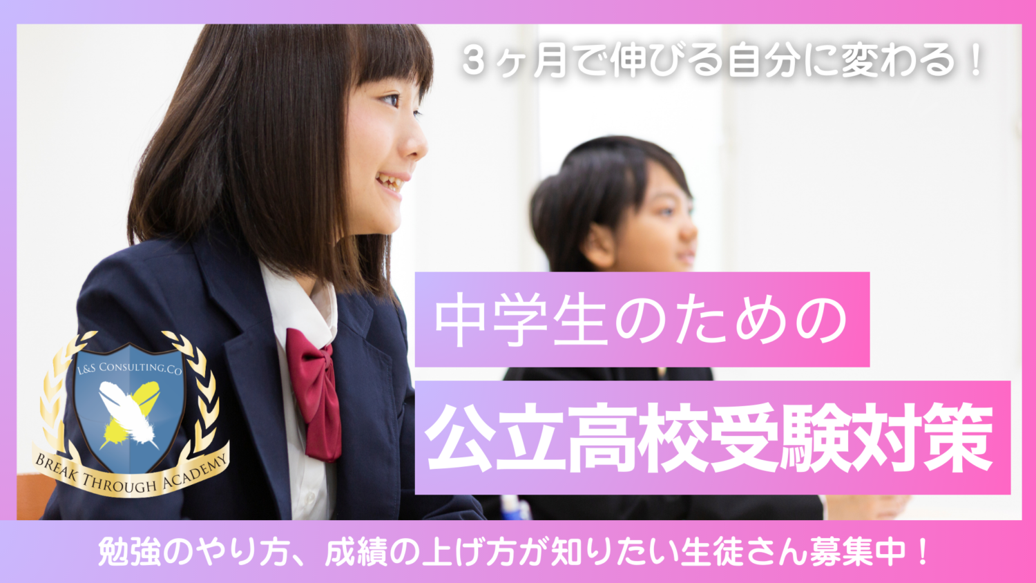 中学生向けの学習塾ブレイクスルー・アカデミーでは、勉強のルール、成績の上げ方、受験競争での勝ち方をベースにした自学フォローを行う学習塾です。一人ひとりに適したサポートを心がけて行ってまいります。もしご興味がございましたら是非お気軽にお声掛け下さい。