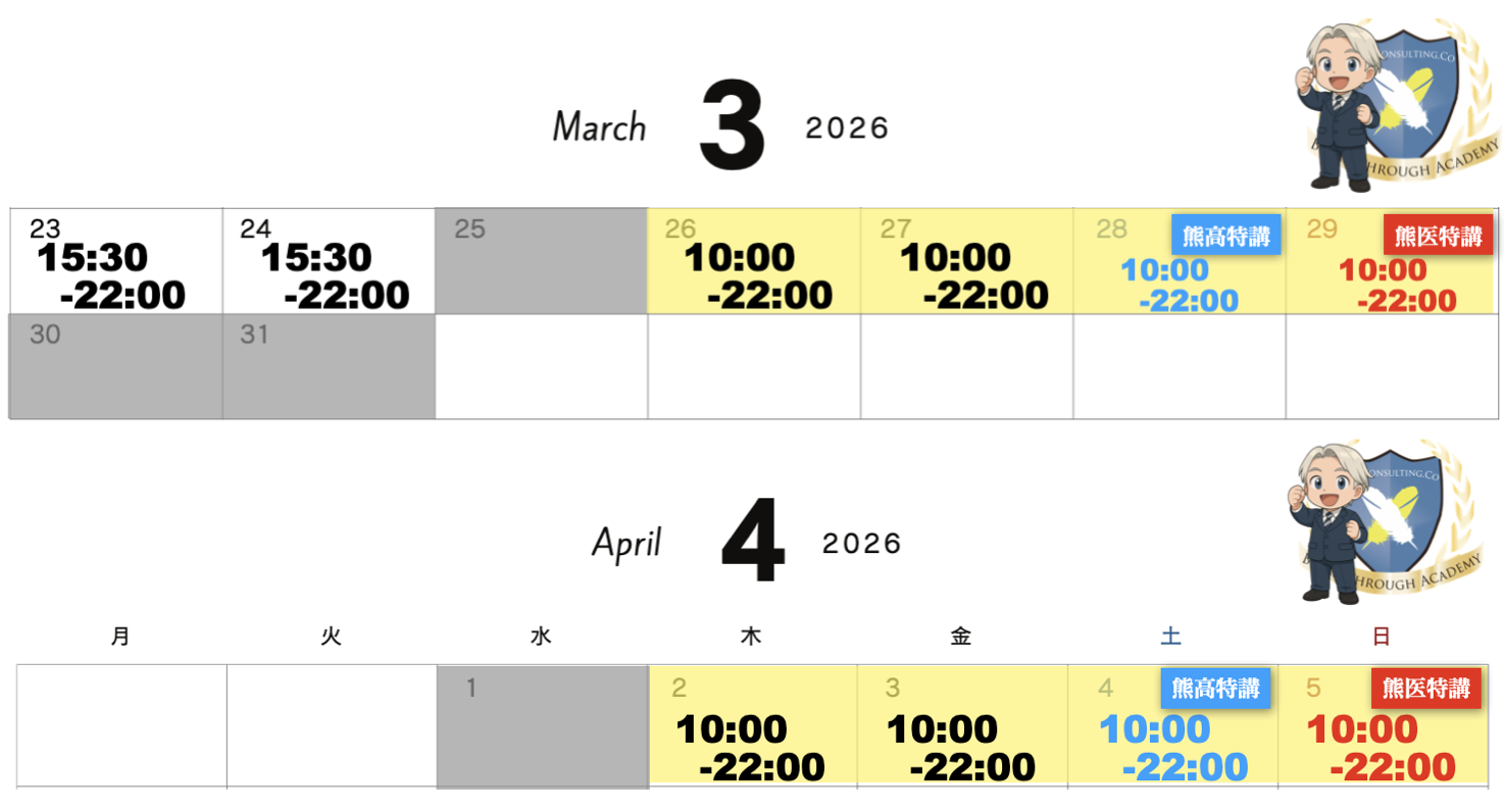 熊本の学習塾ブレイクスルー・アカデミーの春期講習は上記の日程で行われます。