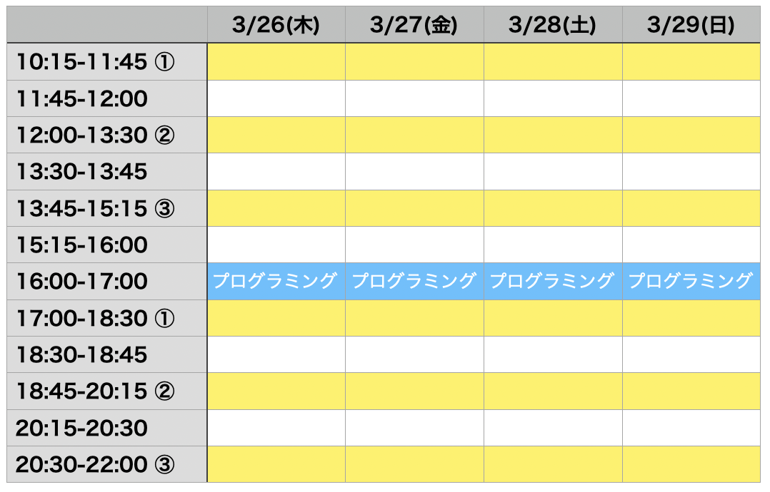 毎日10:00-22:00で開校します。各自のご都合に合わせて、上記の前半①〜③おぽび後半①〜③の授業枠から選んでいただけます。
