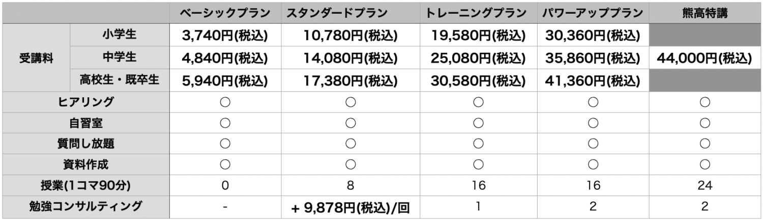 こちらは熊本高校を目指す方専用のプランとなります。授業枠24コマ(8日間毎日前半3コマ分をみっちり)+自習室利用+勉強戦略コンサルティング(90分) 2回分をまるっと受けていただけるプランです。コンサル実施時期はパワーアッププランと同様、春期講習の前後で行います。